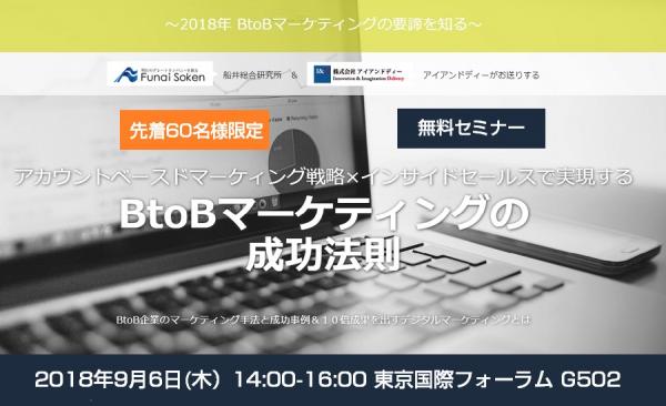 株式会社アイアンドディー(本社:東京都渋谷区 代表:福重広文)は、2018年9月6日(木)東京国際フォーラムにて「~2018年BtoBマーケティングの要諦を知る~ アカウントベースドマーケィング戦略×インサイドセールスで実現するBtoBマーケティングの成功法則」セミナーを開催します。