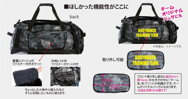 ています。フロント取り外し部分には「チーム名」をプリントまたは刺繍ができ、チームオリジナルバッグにもなります。夏の遠征やクラブ活動に。