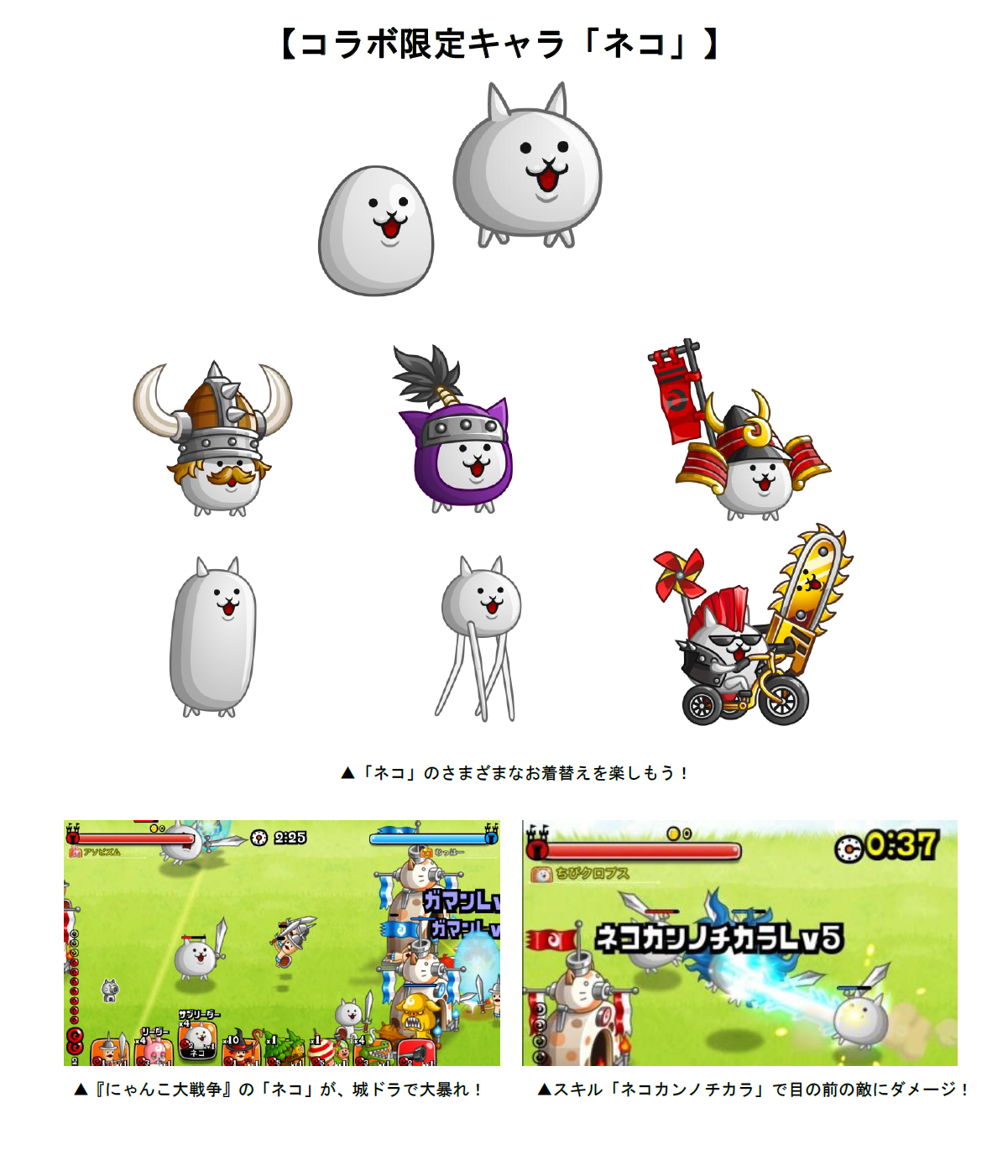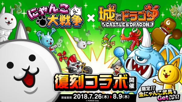 株式会社アソビズム(本社:東京都千代田区、代表取締役:大手智之)は、App Store・Google Playにて好評配信中の『城とドラゴン』で、ポノス株式会社(本社:京都府京都市、代表取締役:辻子依旦)の『にゃんこ大戦争』との復刻コラボイベントを2018年7月26日(木)より開催いたします。期間中、『にゃんこ大戦争』でのミッションをクリアすると、新たなコラボ限定剣士武具セットがもらえるキャンペーンを開催!また、『にゃんこ軍団』が城に攻めてくる襲来イベントや、コラボキャラ『ネコ』の限定お着替えが手に入るバトルキャンペーン、『にゃんこ大戦争』のキャラが登場する討伐イベントなど、期間中しか遊べないイベントが盛りだくさん!期間限定の夢のコラボをどうぞお楽しみください!