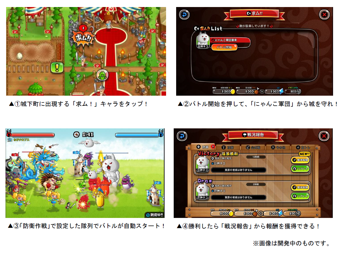 『城とドラゴン』に突如現れた「にゃんこ軍団」の撃退を目指すコラボ襲来イベント「にゃんこ軍団襲来」を開催いたします。コラボ期間中、1日1回、プレイヤーの城に突如「にゃんこ軍団」が攻めてきます。「にゃんこ軍団」が出現した際は、城下町に「求ム!」キャラが登場し、プレイヤーにお知らせしてくれます。襲来イベントは「防衛作戦」を使用して「にゃんこ軍団」を自動で迎え撃ち、勝利すれば報酬が獲得できますので、襲来に備えて防衛隊列を整えましょう!