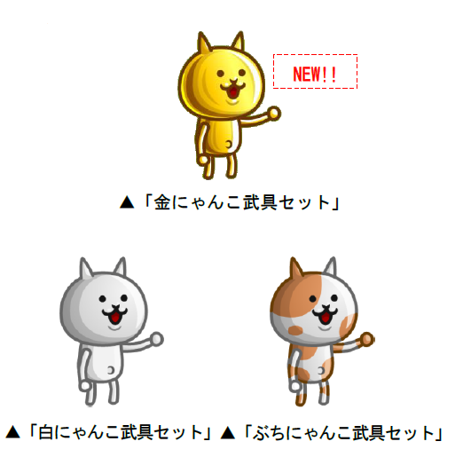 ※「白にゃんこ武具セット」「ぶちにゃんこ武具セット」をすでに持っている方は、「金にゃんこ武具セット」のみ獲得できます。