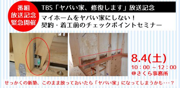 これを記念して、8月4日(土)、同インスペクターによる「マイホームをヤバい家にしない!契約・着工前のチェックポイントセミナー」を開催いたします。