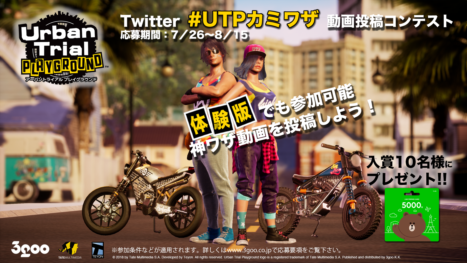 株式会社3goo(サングー)(本社:東京都渋谷区、代表取締役:ディ コスタンゾ ニコラ)では、Nintendo SwitchTM専用ソフト『アーバントライアル プレイグラウンド』の製品版または無料体験版ユーザーを対象に、神ワザ動画コンテストを開催中です。見事選考を経て選ばれた10名の神ワザプレイヤーに、LINEプリペイドカード5,000円分を進呈いたします。