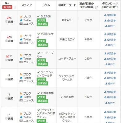 ・ここでは「BLEACH」の出現数が2,426件とトップになっています。