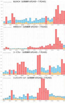 出現数では、やはり「BLEACH」「未来のミライ」の2タイトルが圧倒的で他のタイトルに大きく差をつけています。話題急上昇の要因が気になります。