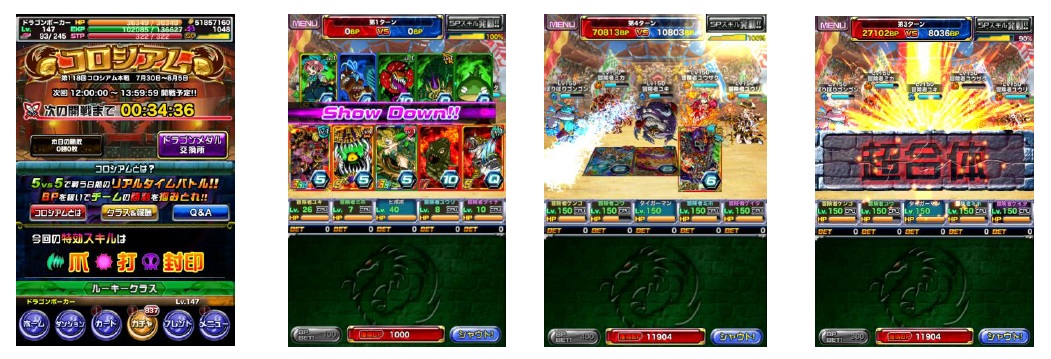 コロシアムのバトルは、5人vs 5人で1人1枚ずつカードを出して役勝負をします。より強い役を作ったチームが先攻となり、相手チームへ攻撃を行います。攻撃時に与えたダメージはBPとして加点され、5ターン終了後、合計BPが多いチームが勝利となります。