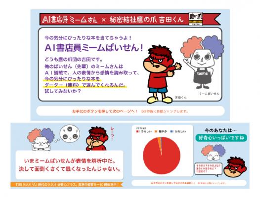 本特別版は、AI書店員キャラクターである「ミームさん」に加え、鷹の爪から吉田くんが助手として参加。先輩書店員のミームさんのAI選書をお手伝いするだけでなく、時には、吉田くんが選書までしてくれるという豪華な内容になっています。