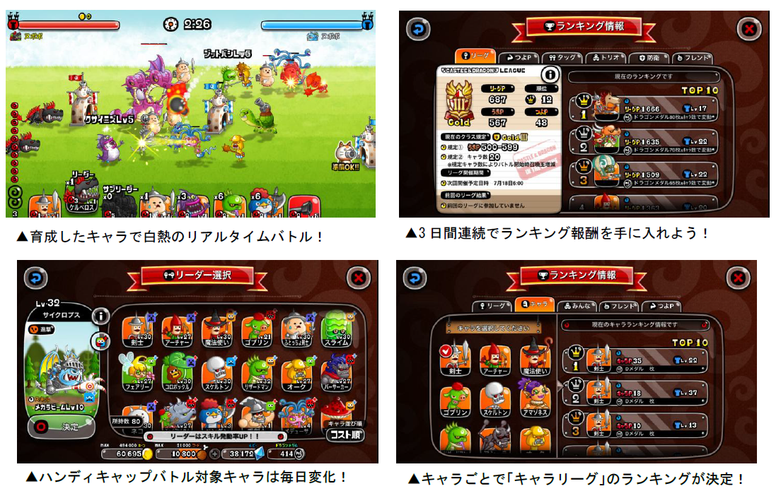 株式会社アソビズム(本社:東京都千代田区、代表取締役:大手智之)は、App Store・Google Playにて好評配信中の『城とドラゴン』で、2018年8月1日(水)より「毎日決着リーグ」および「日替わり選抜キャラリーグ」を開催いたします。毎日選抜キャラを確認し、お気に入りのキャラでランキング上位を目指しましょう!