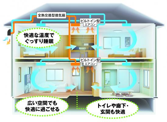 外張W断熱工法による「プレスト エアリア」の躯体そのものから生み出される安定した宅内環境に加え、さらに「空気」「温度」による快適な環境を提供すべく、家中の空気をしっかり管理できる「高性能全館空調換気システム」を標準装備いたします。部屋ごとに設置するルームエアコンとは違い家をまるごと冷暖房するので、各部屋はもちろん、廊下やトイレ、脱衣室など家中どこでもほぼ一定の過ごしやすい温度に保てます。また、全館空調換気システムは高額で電気代も高いという従来のイメージがありますが、「プレスト エアリア」はルームエアコンよりも低いランニングコストを実現します。