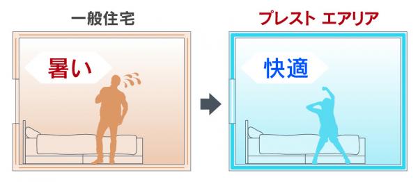 夏の暑い日に冷房を使わずに我慢して過ごしていると、家の中にいながら熱中症になってしまうことがあります。「プレスト エアリア」なら、24時間 家中快適な温度に保つから家の中で起こる熱中症のリスクを軽減することができます。