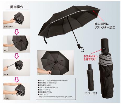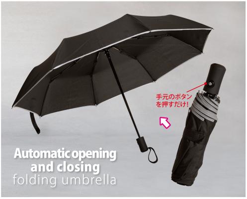 手元のボタンによって、ワンタッチに自動開閉する折りたたみ傘。荷物が多い時や片手が塞がっている時の車の乗り降りなどにとても便利です。傘の周囲にリフレクターパイピングを採用しており、夜間使用の際に反射して安全性を考慮しています。専用カバー付きです。