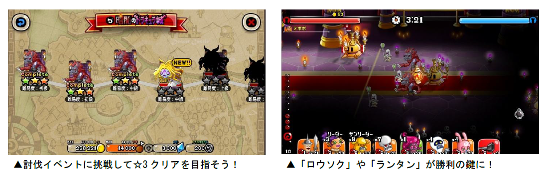 バトル内の「討伐イベント」から、「暗闇のドラキュラ城」に挑戦できます。本イベントは、敵の城を落城させないとステージクリアとならない特別ルールとなっています。「ひとりで」「みんなで」それぞれ1日3回まで、ルビーの消費なしで討伐に挑戦できます。
