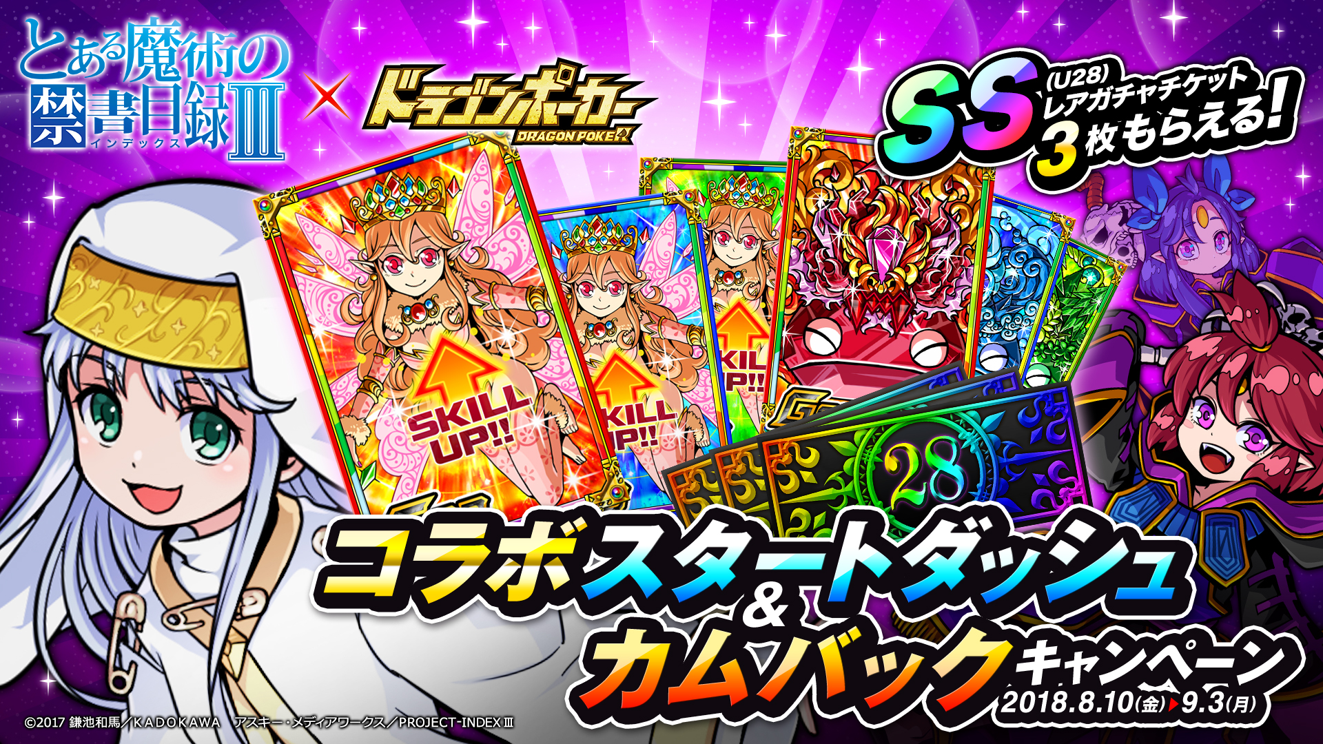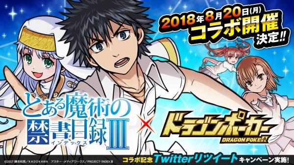 株式会社アソビズム(本社:東京都千代田区、代表取締役:大手智之)は、App Store・Google Playにて好評配信中のリアルタイム合体カードバトル『ドラゴンポーカー』で、2018年8月20日(月)より、アニメ『とある魔術の禁書目録III』とのコラボイベントを開催決定いたしました。コラボ期間中、「上条当麻」や「インデックス」など『とある』のキャラクターたちが期間限定で登場!学園都市を舞台に開催される夢のイベントをお楽しみにお待ちください!