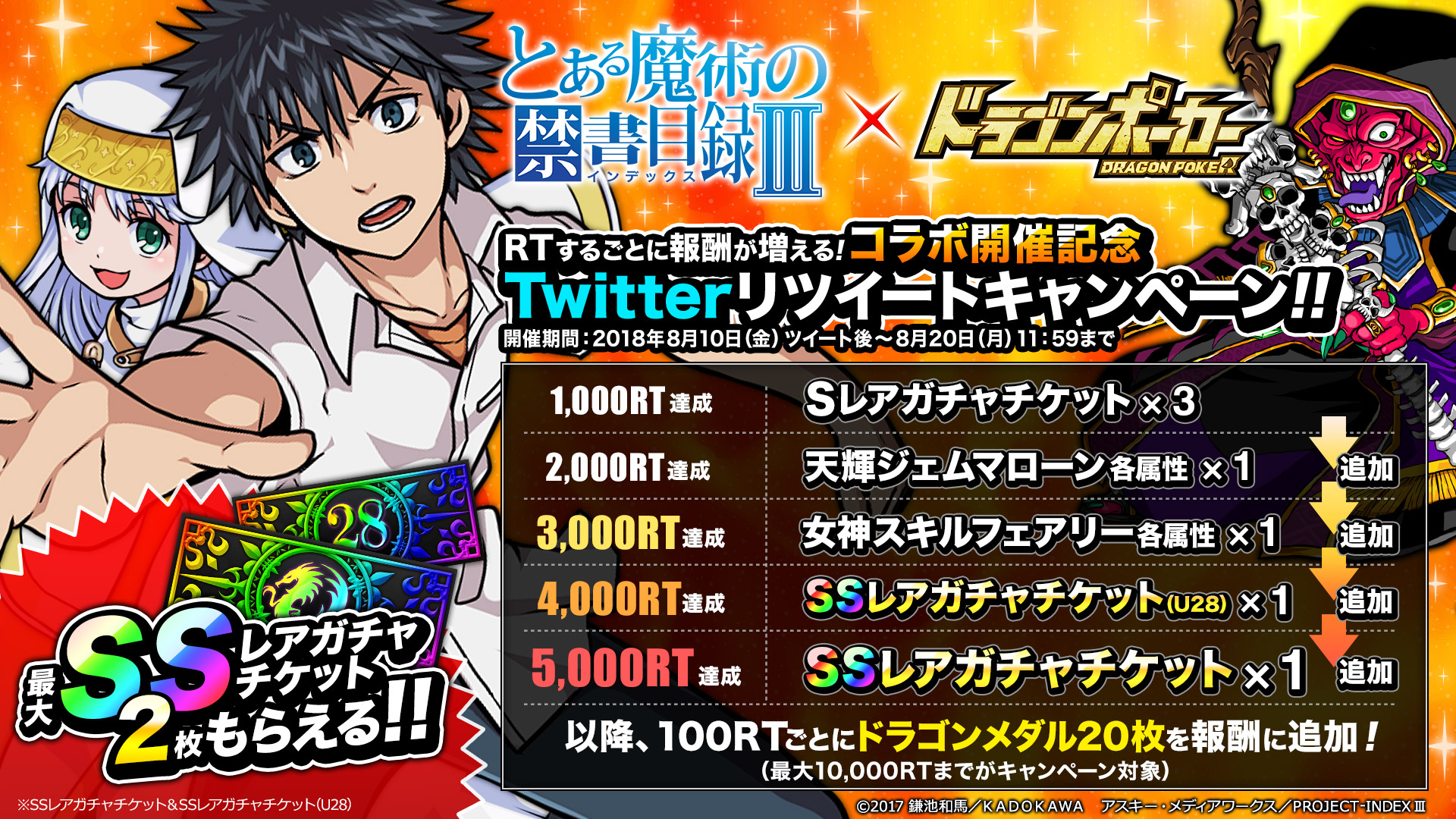 『とある魔術の禁書目録III』とのコラボイベント開催決定を記念して、「Twitterリツイートキャンペーン」を開催いたします。『ドラゴンポーカー』公式Twitterアカウント(@DragonPoker_aso)がつぶやいた、キャンペーン対象ツイートの公式リツイート数が一定数を達成すると、ゲーム内で使用できるアイテムをユーザー全員にプレゼントいたします。