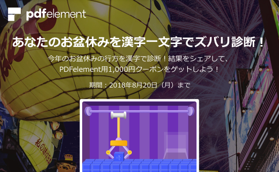 ■応募方法:上記キャンペーン特設ページで今年のお盆休みの行方を漢字一文字でズバリ診断します。Twitter/Facebookで診断結果をシェアしていただくと、PDFelement 6シリーズ製品専用の1,000円クーポンが獲得できます。(シェア完了後、クーポンが自動的にキャンペーンページ画面に表示されます。)