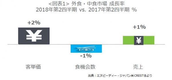 外食・中食市場全体の2018年第1四半期の成長率(図表1)をみると、売上(市場規模)は、5兆213億円で対前年同期比2%増、7期連続のプラス成長となりました。この市場規模の成長は、客単価上昇(+2%)によるものです。客数(食機会数*2)は1%減で、4期連続マイナスかゼロ成長となっています。