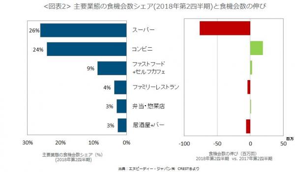 業態別の食機会数の成長率(図表2)をみてみると、全体の26%を占めるシェア1位のスーパーマーケットが前年同期比でマイナス77百食機会(3%減)と大きく減少しました。スーパーのマイナス成長は6期連続です。今期は外食・中食市場の食機会数減少の67%を占め、全体の減少の9割以上を占めていた前期ほどではありませんが、もっとも客数減少に影響を与えました。