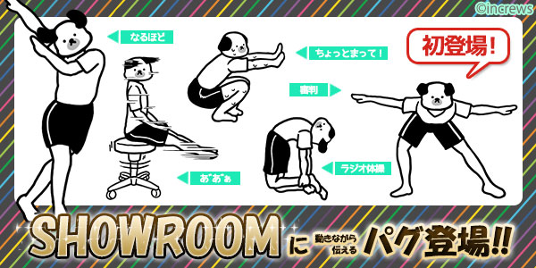 株式会社インクルーズ(東京都渋谷区、代表取締役 山崎 健司)は、大ヒットLINEスタンプ「動きながら伝えるパグ」のパグが、SHOWROOM株式会社が運営する仮想ライブアプリ「SHOWROOM」のアバターとして販売開始しました事をご報告致します。