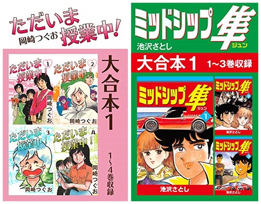 ゴマブックス株式会社(所在地:東京都港区、代表取締役社長:赤井仁)は、2018年8月17日(金)より、Kindleストア、楽天Kobo電子書籍ストア、iBooks、ならびにSONY Reader Storeにて、『ただいま授業中!』(岡崎つぐお=作)、『ミッドシップ隼』(池沢さとし=作)などコミック「大合本」シリーズ11作品の配信を開始いたしました。
