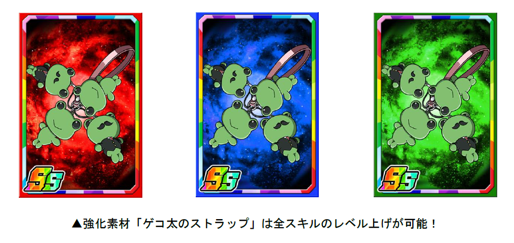 「禁書目録 P」を使い、素材ガチャを回すと限定強化素材「ゲコ太のストラップ」を手に入れることができます。「ゲコ太のストラップ」は経験値がアップするだけでなく、全スキルのレベル上昇率がアップします。たくさん集めてカードを強化していきましょう!