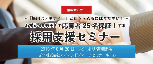 法人向け販促・マーケティング支援と人材採用総合コンサルティングの株式会社アイアンドディー(本社:東京都渋谷区 代表:福重広文)は、各種デジタル採用媒体を利用して25名の応募者数を保証し、あわせて採用Webサイトが何ページでも簡単に作成できる、リクルートオートメーション『Dr.Recruit』を1年間ご提供した『採用支援セミナー』を2018年8月28日(火)より代々木上原にて毎週開催します。