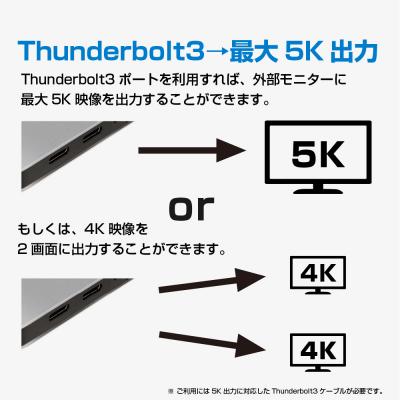 ・Thunderbolt3対応:Thunderbolt 3は最大5K出力、もしくは4Kディスプレイ2画面に出力可能