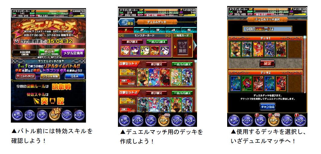 デュエルマッチでは、通常よりも高い効果を発揮する「特効スキル」が設定されています。今回の「デュエルマッチ」の特効スキルは、突・咬です。特効スキルのカードをデッキに入れて、有利にバトルを勝ち進めましょう。