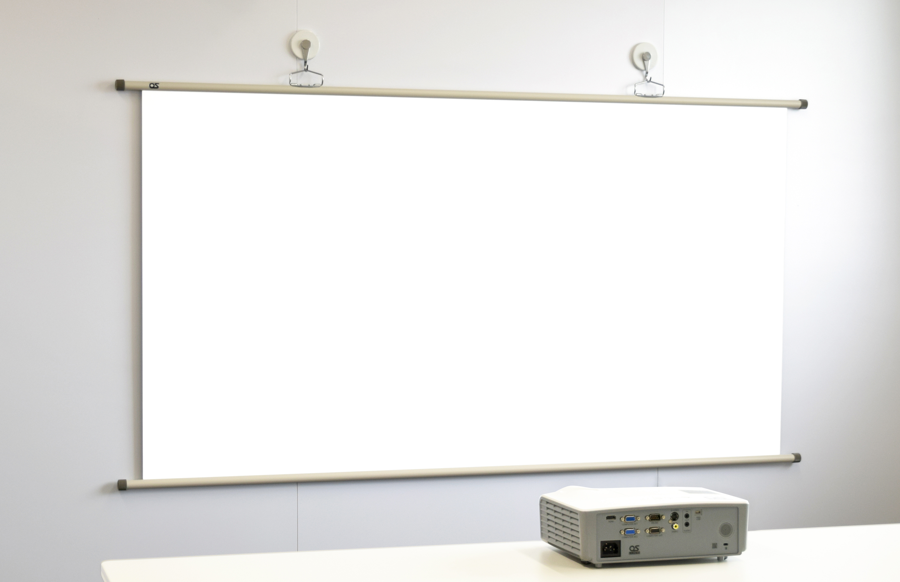 セットするスクリーンは、オーエスが最も安定供給をし、出荷の80%を締めるホワイトマット(拡散型)生地を採用、フックさえあればどこでも取り付け可能な掛図スクリーンです。