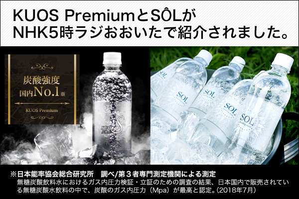 株式会社 OTOGINO(オトギノ:代表取締役社長 鬼武公洋 本社 大分県日田市北友田 2 丁目 2123 番地 1)が販売しているKUOS Premium(クオス プレミアム)と炭酸水 SÔL (ソール) が、8月24日(金)NHK大分放送のラジオ番組『5時ラジ・おおいた』で放送されました。番組のコーナーでは『爽快!大分の炭酸水』というテーマで、強炭酸水KUOS Premiumの美味しさや、美のミネラルとも呼ばれるシリカが多く含まれたミネラル炭酸水SÔL の魅力など、スタジオで試飲しながら紹介していただきました。