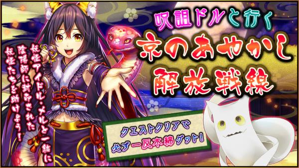 株式会社シグナルトーク(代表取締役:栢 孝文/所在地:東京都大田区)は、スマートフォン向けRPG『ダンまつま!~ダンジョンで待ってます!~』において、8月31日(金)より「呪詛ドルと行く 京のあやかし解放戦線」を開催いたしました。限定モンスターやアイテムがゲットできるイベントクエストをお楽しみいただけます。また、新キャラクターが登場し期間限定でピックアップ召喚も開催いたします。