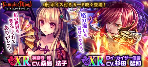 ソーシャルゲーム開発を行う、株式会社テンダ(本社/東京都豊島区、 代表取締役会長/小林 謙)は、「mobage(モバゲー)」など各ゲームプラットフォームで提供中のソーシャルゲーム『ヴァンパイア†ブラッド』にて8月30日(木)より「<XR>神宮寺 雅(CV. 桑島法子)」「<XR>ロイ・カイザー伯爵(CV. 杉田智和)」のボイス付きカードを追加することをお知らせいたします。