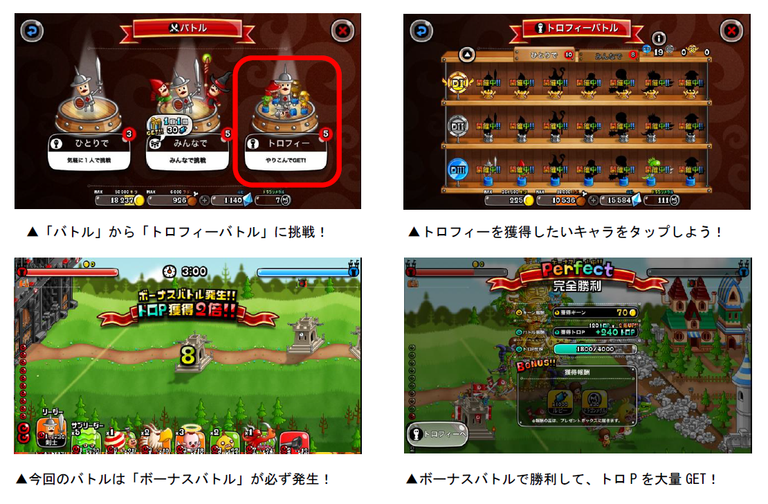 各キャラのトロフィーは、「トロP」を一定数貯めると獲得することができます。トロPを獲得するには、「キャラのLvが20以上」「うまP200以上」など各キャラによって条件が異なります。条件を満たした状態でバトルを行なうことでトロPを獲得できます。また今回は「ボーナスフィーバー」が同時開催され、全てのトロフィーバトルが、獲得トロPが2倍以上となります。「ボーナスバトル」はバトルの勝敗に関係なく、獲得トロPが2・3・5・10倍のうちいずれかの倍率で増加します。「ボーナスバトル」で勝利してトロPの大量獲得を目指しましょう!