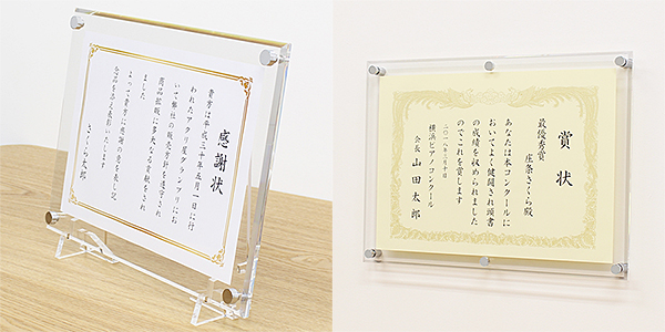 賞状額の為に専用設計された今までにないアクリ屋ならではのクリアスタンドです。8mm厚の板を使用しているので重厚で存在感のある飾り方が出来ます。