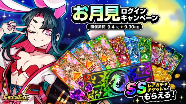 株式会社アソビズム(本社:東京都千代田区、代表取締役:大手智之)は、App Store・Google Playにて好評配信中のリアルタイム合体カードバトル『ドラゴンポーカー』で、2018年9月4日(火)より 「お月見ログインキャンペーン」を開催いたします。5日ログインごとに「女神スキルフェアリー」や「天輝ジェムマローン」など豪華アイテムをプレゼント!ログイン25日目には「SSレアガチャチケット」が必ずもらえます。『ドラゴンポーカー』に毎日ログインして、豪華報酬を受け取りましょう!