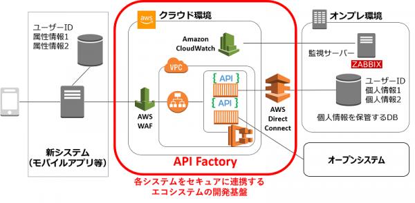 「API Factory」の構築基盤にはアマゾンウェブサービス(以下、「AWS」)が提供するAWSクラウドサービスプラットフォームを採用しました。さらに、API※/コンテナー※技術を採用したことにより、システムを互いに独立させて動かすことができるようになり、継続的な開発・運用を実現します。