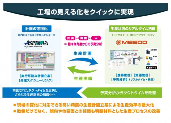 アスプローバ株式会社(本社:東京都品川区、代表取締役社長:高橋 邦芳)、ウイングアーク1st株式会社(本社:東京都港区、代表取締役社長:田中 潤)、トーテックアメニティ株式会社(本社:愛知県名古屋市、代表取締役社長:坂井 幸治、以下TOTEC)の3社は、アスプローバの生産スケジューラー「Asprova」とウイングアークのMESアプリケーション「MESOD(メソッド)」を連携させることにより、「工場の見える化」を短期に実現することを本日発表します。