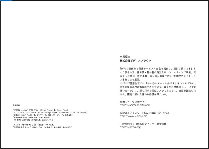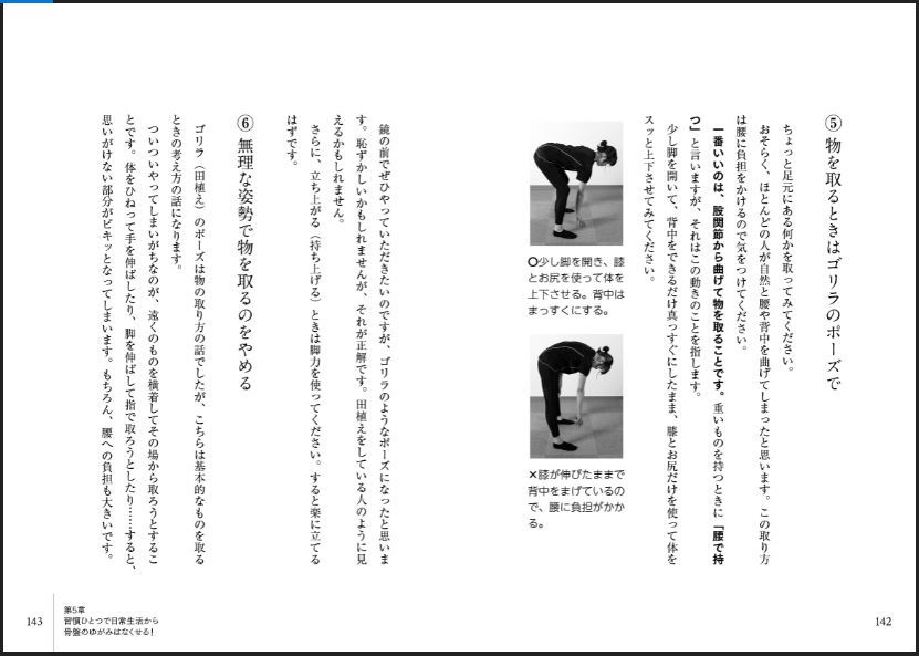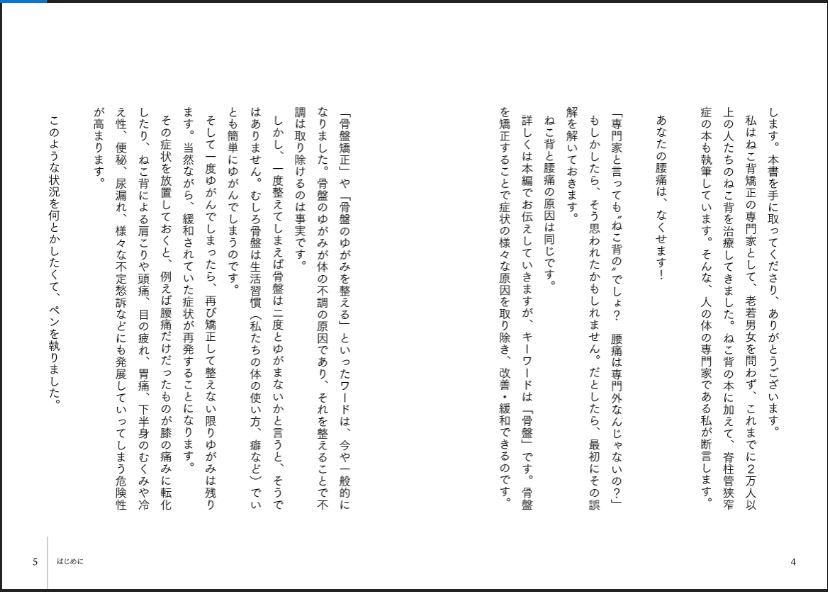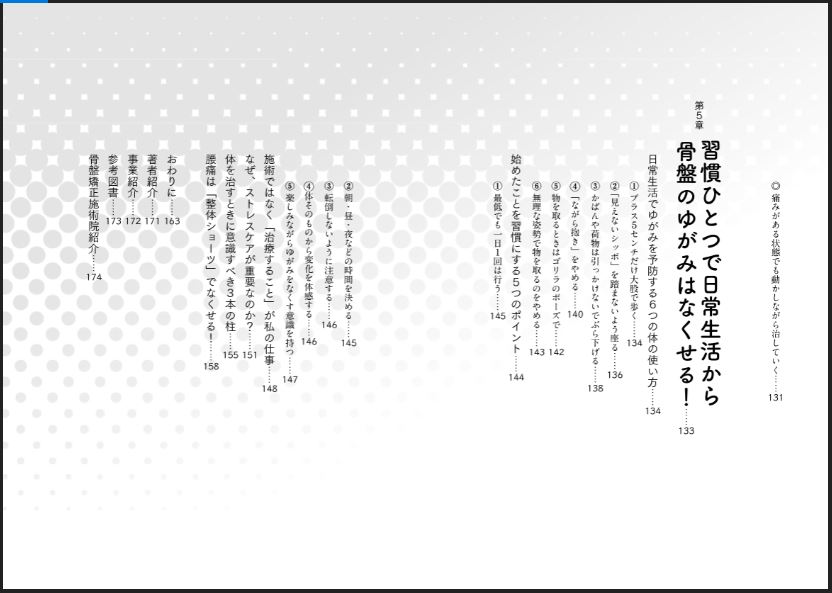 主な著書に「ねこ背は10秒で治せる!」(株式会社マキノ出版)、「脊柱管狭窄症 自力で治す!痛みをとる!」(英和KOOK)など。
