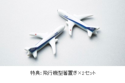 人気特典として、毎年ANA機をかたどった箸置き2点がセットで付いています。毎年異なる機種をご用意する箸置きは、飛行機好きにはたまらないアイテムとしてお楽しみいただいております。今年はB777型機が登場です!
