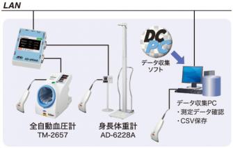 この健康・健診データ収集システムは、健診分野で実績の多いA&D機器をはじめとした36機種を厳選し、標準接続できるシステムで、オプションを含む47機種の接続が可能です。