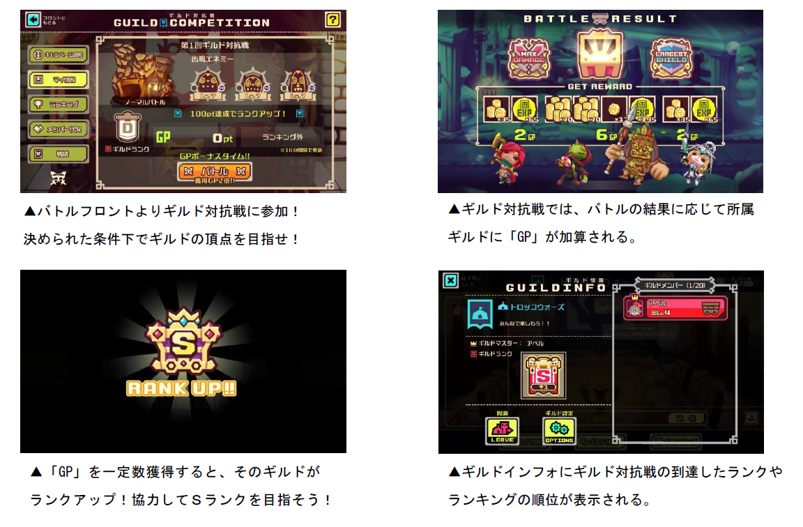 「第16回ギルド対抗戦」は期間中、各ギルドを相手に、指定されたダンジョンとバトルモードでの戦績を全国のユーザーと競い合うイベントです。ギルド対抗戦は毎回Dランクからスタートし、ギルドメンバーの行ったバトル結果に応じてそのギルドに「GP」が加算されます(宝箱:6GP, MD:2GP, LS:2GP)。「GP」が一定ポイントに到達するとランクがアップします。Sランクからは「GP」の累計でランキングに参加することが可能です。力を合わせて、所属するギルドでランキング入りを目指しましょう!