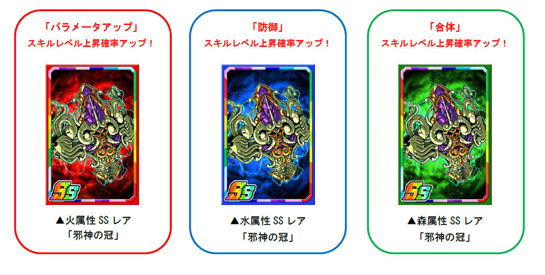 「邪神P」を使い、素材ガチャを回すと、限定の強化素材「邪神の冠」を手に入れることができます。「邪神の冠」は経験値がアップするだけでなく、一部のスキルレベル上昇確率もアップします。