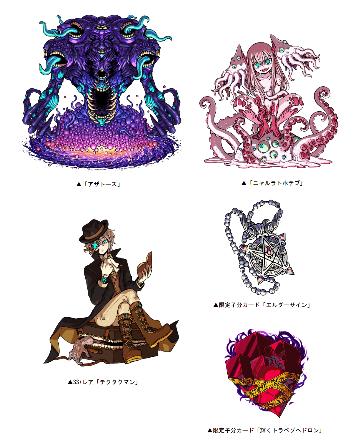 本ダンジョンにはボスとして、「アザトース」や「ニャルラトホテプ」「チクタクマン」が登場!クリアした際に手に入る「混沌P」を貯めると、SS+レア「チクタクマン」、限定子分カード「エルダーサイン」「輝くトラペゾヘドロン」と交換することができます。