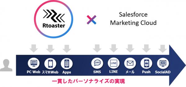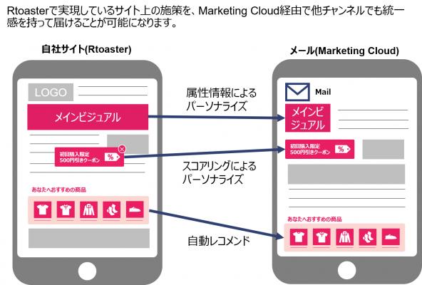 これにより、「Rtoaster」が得意とするサイト内での行動ターゲティング・レコメンドといった高精度なパーソナライズ施策を、「Marketing Cloud」が得意とするEメール、モバイル、SMS、LINEなどのさまざまなサイト外のチャネルでも活用できるようになり、両ソリューションを通じて一貫したカスタマーエクスペリエンスの提供を推進することが可能になります。