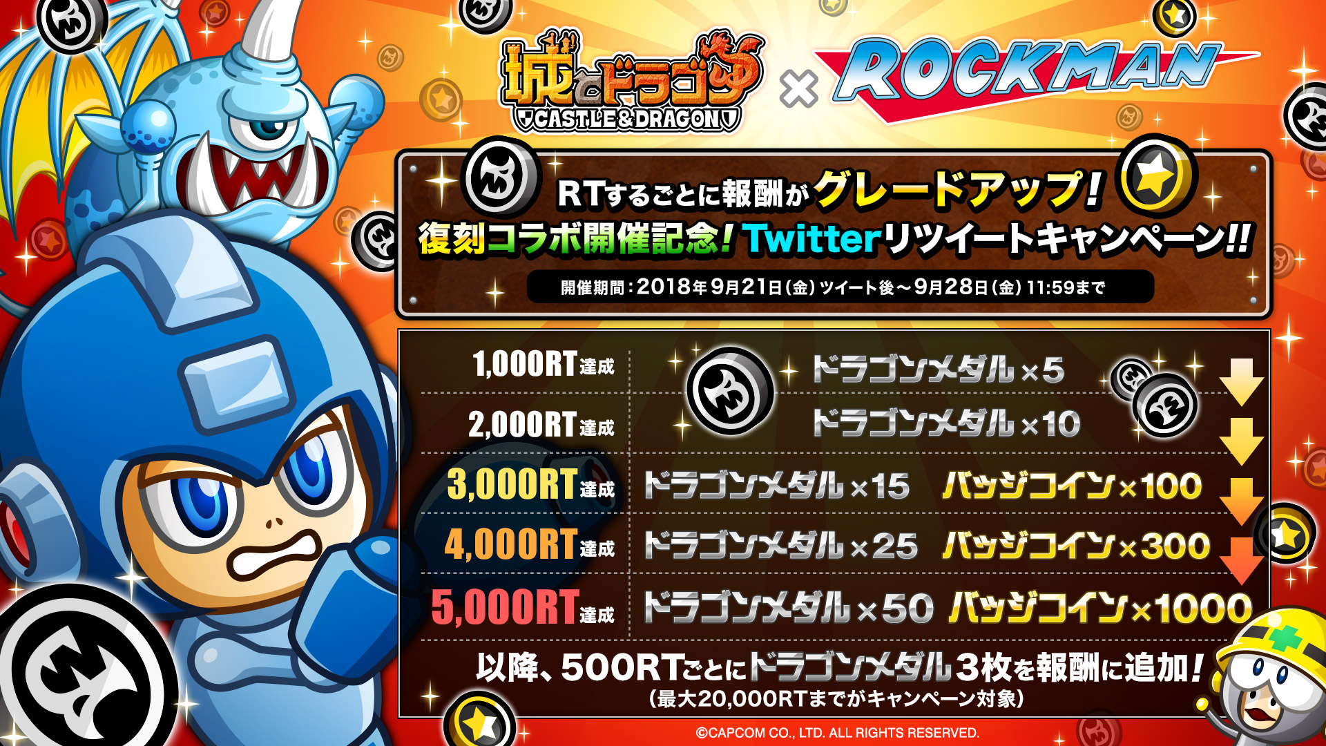 『ロックマン』との復刻コラボイベント開催決定を記念して、「Twitterリツイートキャンペーン」を開催いたします。『城とドラゴン』公式Twitterアカウント(@shirotodoragon)がつぶやいた、キャンペーン対象ツイートの公式リツイート総数に応じて、最大でドラゴンメダル50枚や、バッジコイン1,000枚をユーザー全員にプレゼントいたします。