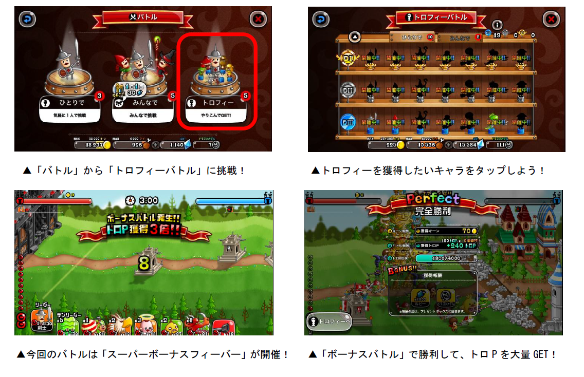 各キャラのトロフィーは、「トロP」を一定数貯めると獲得できます。トロPは「キャラのLvが20以上」 「うまP200以上」など、各キャラによって異なる条件を満たした状態でバトルを行なうと獲得できます。また、今回は「スーパーボーナスフィーバー」が同時開催され、全てのトロフィーバトルで「ボーナスバトル」が発生します。ボーナスバトルではバトルの勝敗に関係なく、獲得トロPが必ず3・5・10倍のうちいずれかの倍率で増加します。ボーナスバトルで勝利して、トロPの大量獲得を目指しましょう!