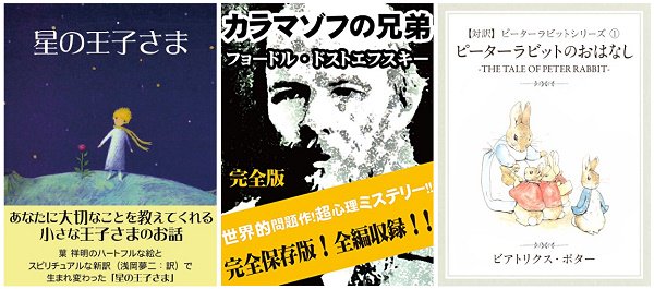 今回割引対象となるタイトルは、2018年8月の【文学】書籍のダウンロード数ランキング(集計対象ストア:Kindleストア、楽天Kobo電子書籍ストア、Google Play、iBooks、SONY Reader Store、Yahoo!ブックストア)で1位に輝いた『星の王子さま』、2位の『カラマゾフの兄弟 完全版』、3位の『【対訳】ピーターラビット(1) ピーターラビットのおはなし -THE TALE OF PETER RABBIT-』の計3作品です。