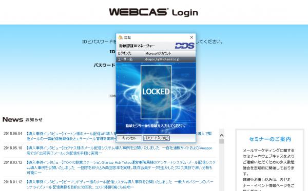 認証ソリューション「EVEシリーズ」と連携した状態で「WEBCAS」を起動すると、指紋認証など多要素認証用の画面が自動起動します。例えば、指紋認証の場合、認証画面で指紋を入力することで「WEBCAS」に自動でログインすることができます。