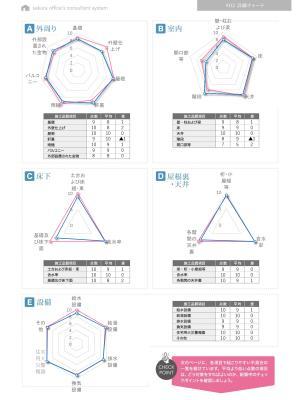 新築戸建の診断時に「不具合がないか」といったチェックポイントとなる「外周り」「室内」「床下」「屋根裏・天井」「設備」の5項目を数値化してレーダーチャートで可視化。さらにインスペクターからの解説とアドバイスも記載しています。