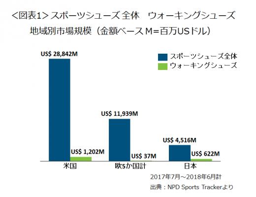 同期間でのウォーキングシューズの金額シェアは、米国では4%、欧州5か国計では1%未満、日本では14%で、日本でのシェアは米国の3倍、欧州の10倍以上となります。ウォーキングシューズの市場規模を見ると、米国の0.52倍、欧州の17倍あり、日本のウォーキングシューズ市場が世界的に見ても大きいことがわかります(図表1)。