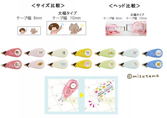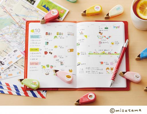 今回数量限定で登場の「mizutamaデザイン」は、ふんわりやわらかいラインと癒し系のキュートなキャラがかわいいmizutamaワールドが全開。女の子や動物、スイーツなどをモチーフにしたイラストで毎日の手帳をより表情豊かに表現できます。実用的な「予定ワンポイント柄」、余白をかわいく飾る「デコレーション柄」に加え、文字の上からデコできる「マーキング柄」も新登場です。メーカー希望小売価格(税抜)は各300円です。